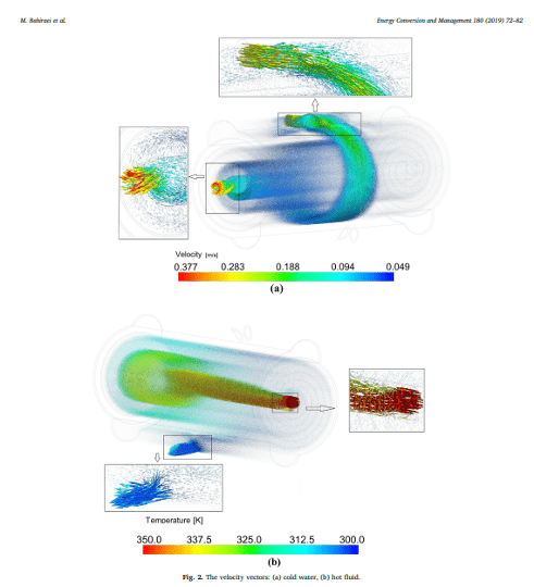 با استناد به مقاله پیوست شده، تصویر a وکتور های سرعت سیال سرد و تصویر b وکتورهای سرعت سیال گرم را در مبدل حرارتی حلزونی صفحه ای نشان می دهند. همان طور که از خروجی جریان سیال سرد پیداست ساختار هیدرو دینامیکی مبدل به گونه ای است که باعث ایجاد چرخش در جریان سیال شده این مسئله بهبود انتقال حرارت در مبدل را به دنبال دارد.